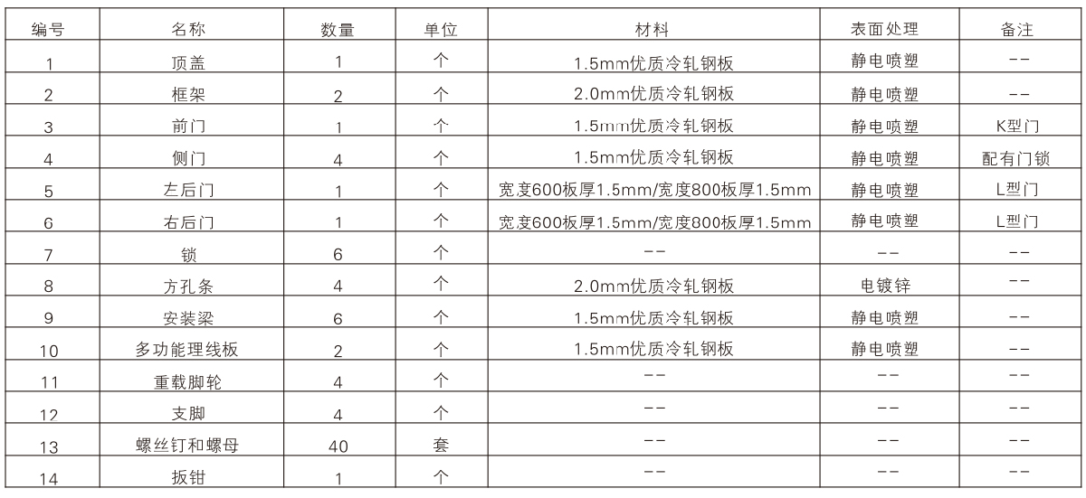 全部使用优质冷轧钢板制作:厚度:方孔条2.0mm,框架1.5mm,层板、侧门1.5mm。