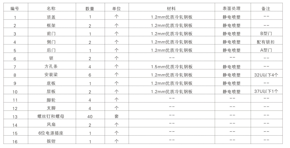 产品规格及标准:18U、24U、28U、33U、42U、47U(备注:1U=44.45mm)